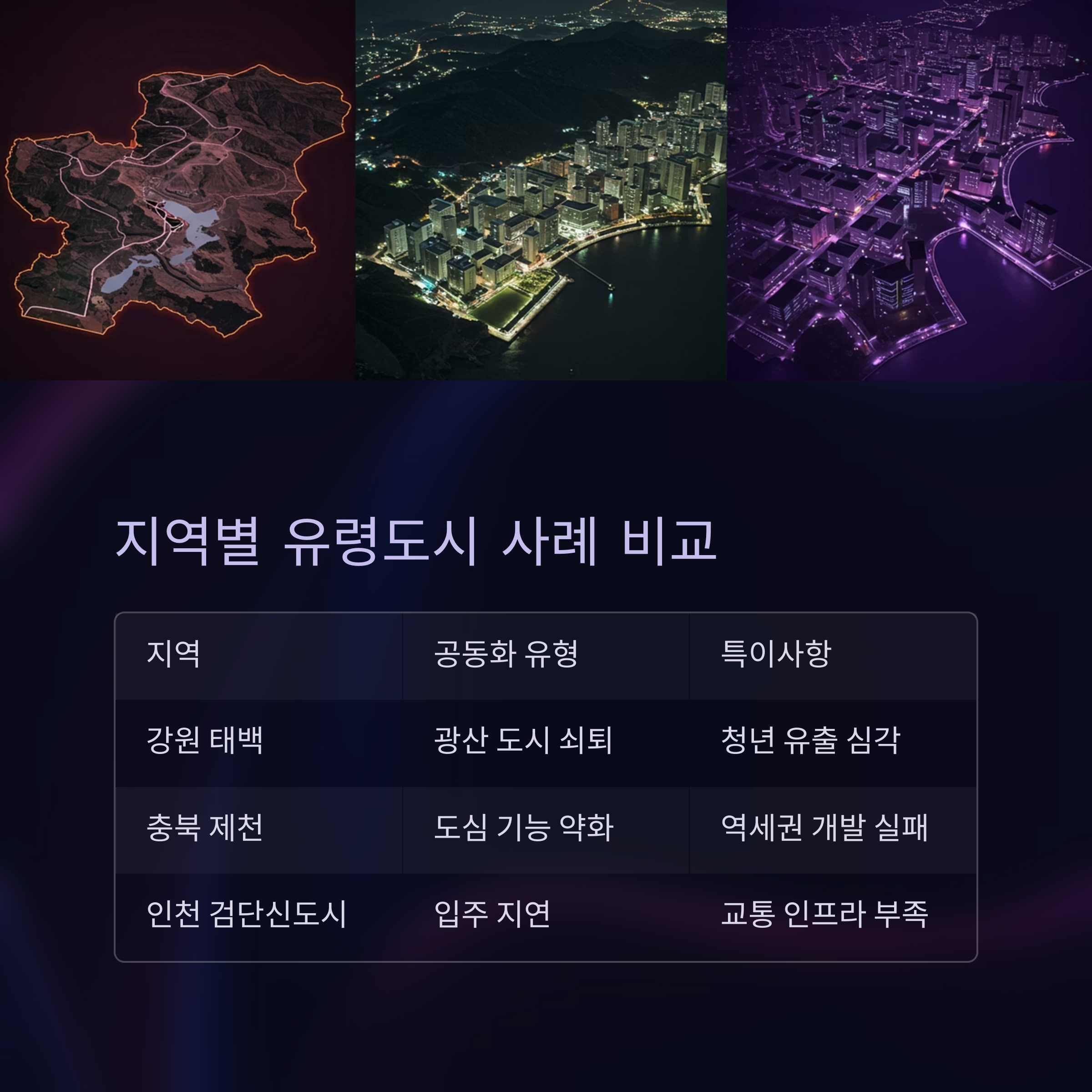 각 지역마다 유령도시화가 진행되는 양상은 조금씩 다릅니다. 아래 표는 대표적인 사례를 비교한 내용입니다.