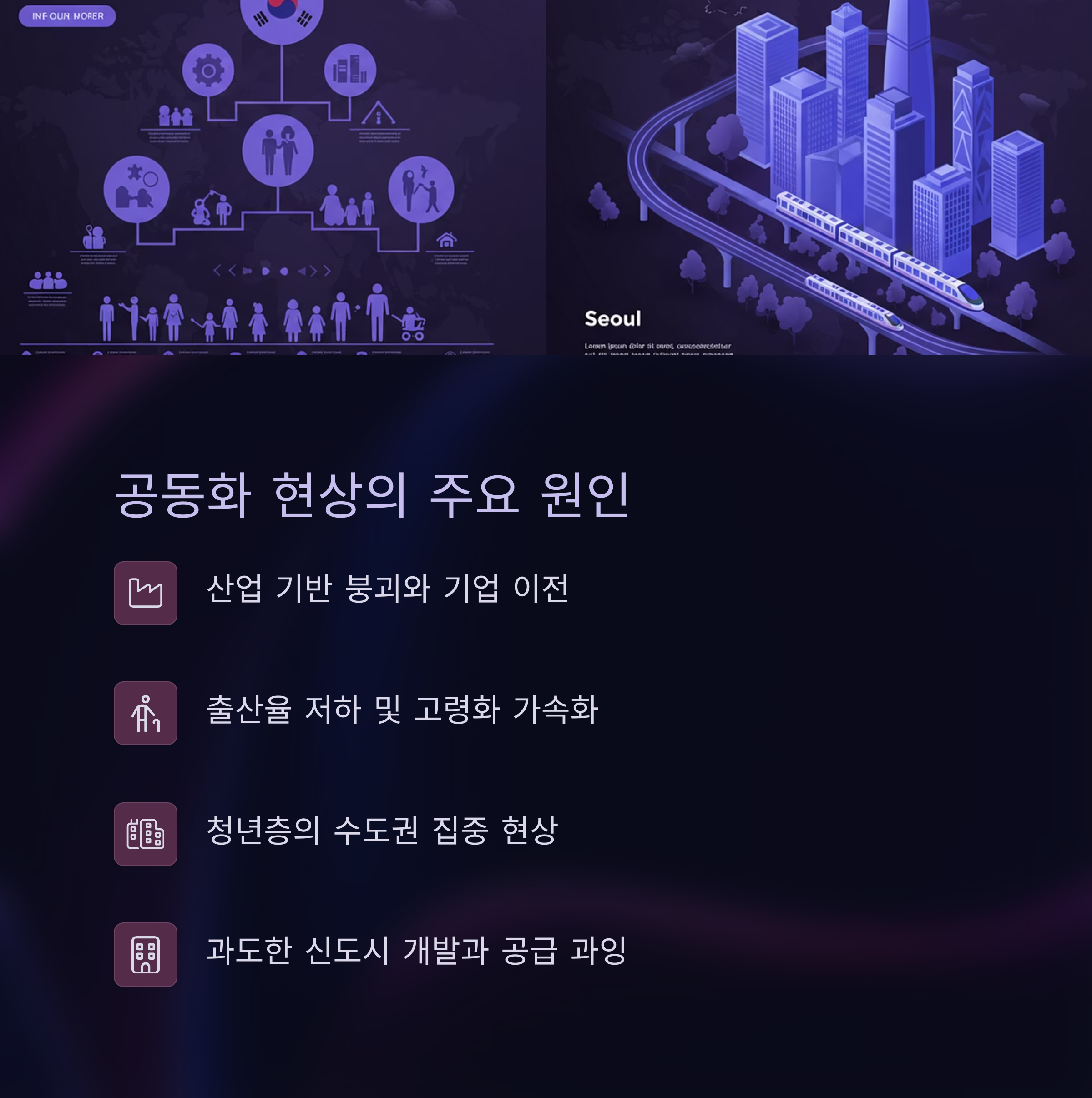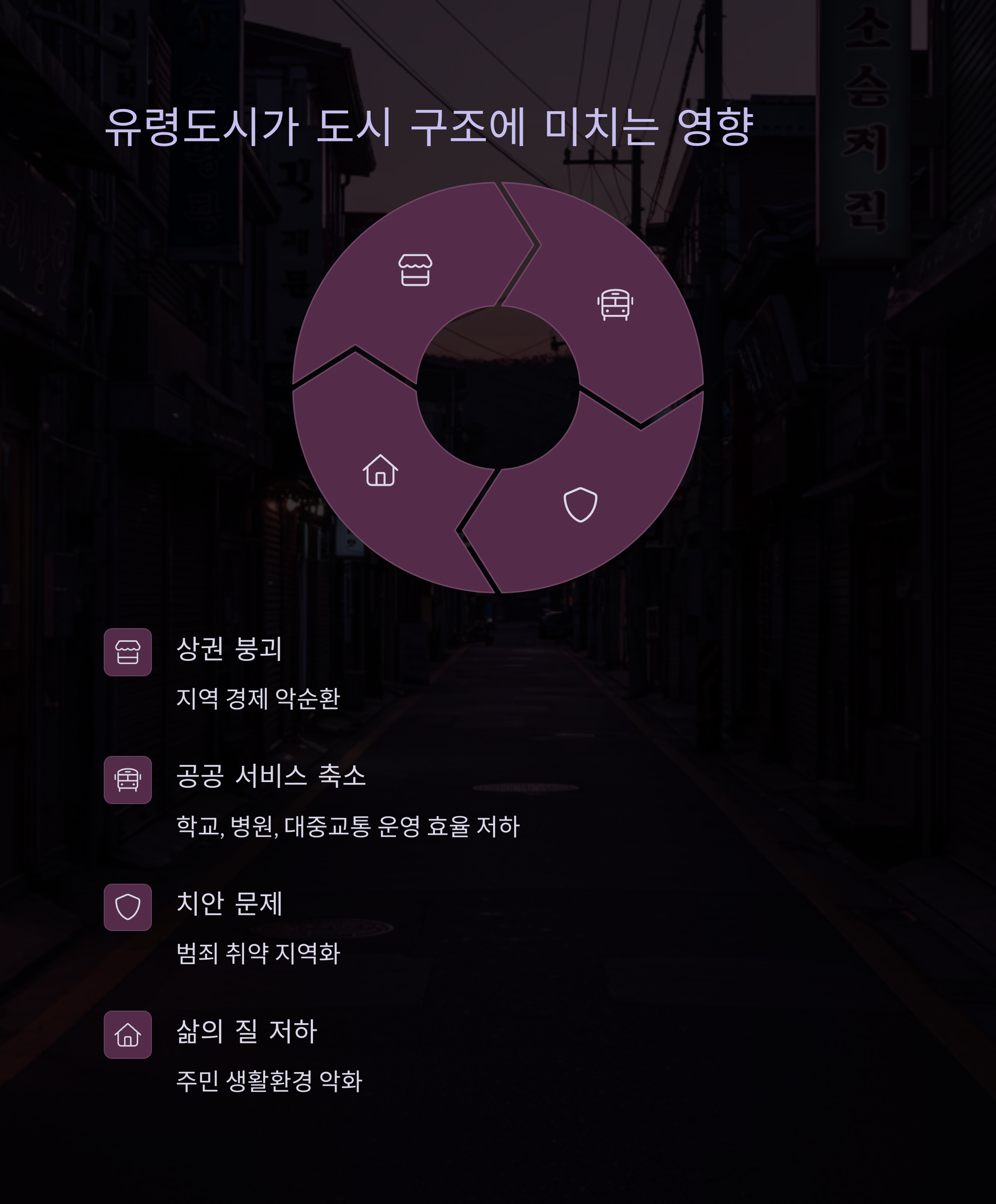 기반 인프라의 유휴화, 상권 붕괴, 치안 문제, 그리고 지역 경제의 악순환으로 이어지는 복합적 파장을 일으키죠.